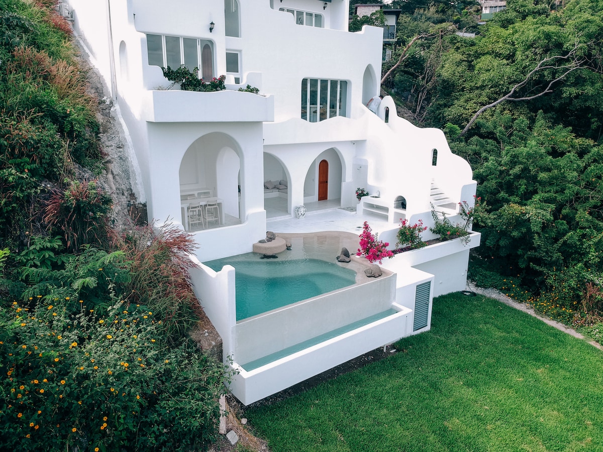 📍 Ласкаво просимо на нашу віллу в стилі Санторіні в центрі Серф-Сіті, Сальвадор. Наш новозбудований будинок, розташований усередині найексклюзивнішої закритої пляжної спільноти в Сальвадорі, поєднує в собі середземноморську архітектуру, спокійні краєвиди на океан і вишуканий комфорт — ідеальний варіант для сімей і груп, які шукають стилю, спокою та близькості до Ель-Тунко та Ель-Сонте.