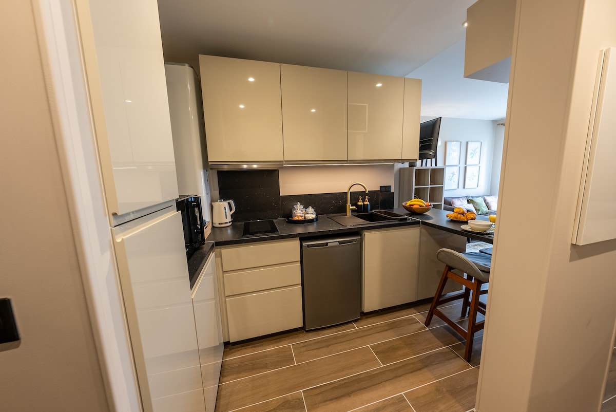 тиха і стильна, невелика автономна студія в саду таунхаусу. Міні-будинок у стилі міні-будинку. Добре обладнано. Диван-ліжко з якісною постільними речами для щоденних спальних місць. Підстава ліжка та матрац 45 кг/м3. Затишна ванна кімната. Зберігання. Обладнана міні-кухня, гриль для мікрохвильової печі, пральна машина, міні посудомийна машина, дрібна побутова техніка. Парковка для невеликих автомобілів. Зовнішня тераса зі столом, стільцями та кріслами для відпочинку