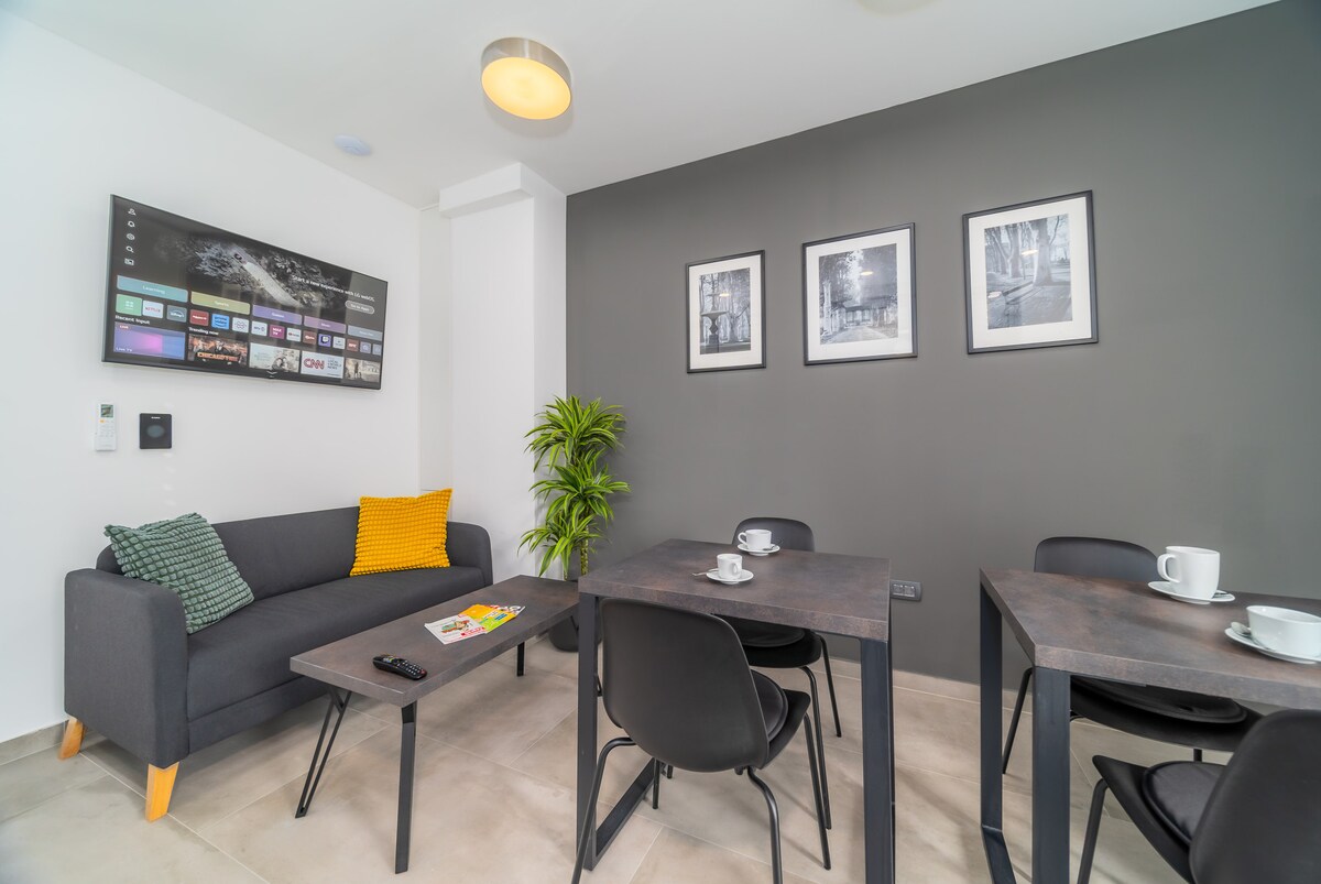 Квартира пропонує помешкання з терасою. Серед зручності в цьому помешканні є приватною реєстрацією прибуття та виїзд, а також безкоштовний Wi-Fi. У квартирі є сімейні кімнати. Апартаменти в житловому комплексі оснащені кондиціонером, зоною відпочинку, телевізором з плоским екраном і послугами потокового передавання, кухнею, обідньою зоною та окремою ванною кімнатою з ванною, тапочками і фен. Духовка, мікрохвильова піч і тостер також пропонується, а також кавоварка та чайник.