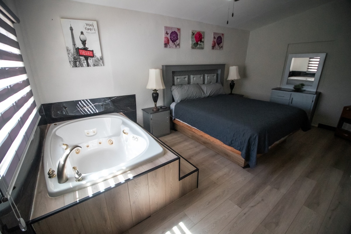 Dos Enamorados 🤍 Espacio ideal para parejas que buscan privacidad, comodidad y un ambiente romántico. Disfruten de jacuzzi dentro de la habitación, perfecto para relajarse en total intimidad. Cuenta con amplio patio, estacionamiento privado, cocina completamente equipada, sala con TV, centro de lavado y 2 baños completos. Ideal para escapadas, aniversarios o simplemente para desconectarse juntos.