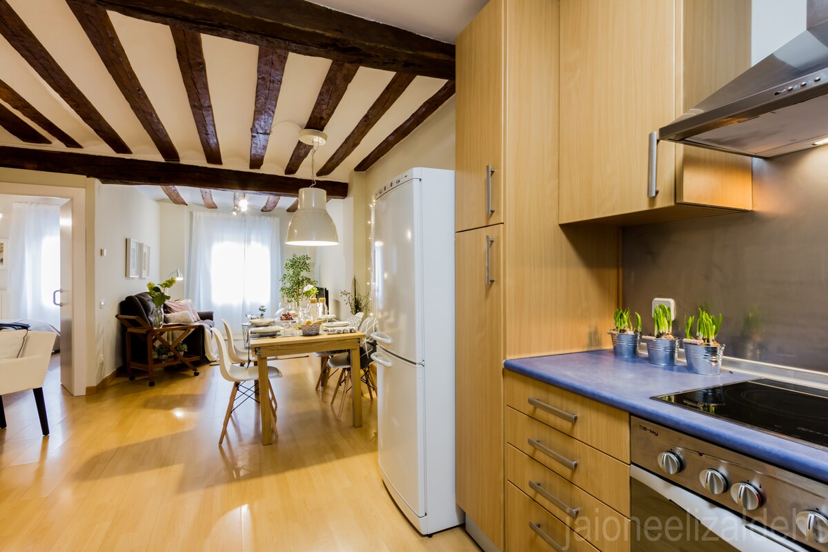 Це квартира площею 60 кв. м,розташована на першому поверсі нещодавно відреставрованої будівлі,в центрі історичного старого міста Памплона,недалеко від собору. Він наповнений світлом і функціональний, в той же час затишний. У ньому є два спальні з двоспальними ліжками,кожне з яких має гарний балкон з видом на дві популярні вулиці. У вітальні є телевізор і пристрій Wi-Fi. Кухня повністю обладнана, а у ванній кімнаті є душова піна, шампунь і фен.
