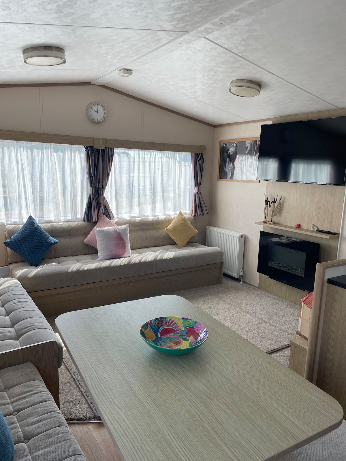 Статичний автофургон на 3 спальні в жвавому парку автофургонів Seawick. У автофургоні є дві спальні з двома односпальними ліжками, одна двоспальна кімната та один двоспальний диван-ліжко. У вашому розпорядженні також будуть критий і відкритий басейни, клуб із денними та нічними розвагами, бар, що подає їжу, пляж, супермаркет, ігровий зал та пральня в декількох хвилинах ходьби. Крім того, ви можете скористатися нашими сусідніми парками відпочинку. Самостійна реєстрація прибуття, замок на дверях, і ми надамо код до вашого прибуття. Зверніть увагу, що перепустки доставляються окремо, див. фото
