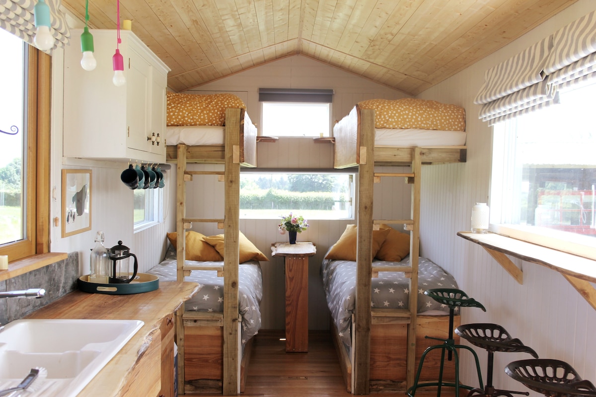 Розкішна пастуша хата, окрема душова кімната та дров 'яна конфорка, розташована в саду. Ми керуємо ліцензованою школою верхової їзди, Кінним центром Ред-Парку та багато дружніх коней та поні. Повністю самостійний блок, добре обладнаний - повнорозмірний холодильник, холодильник, дві поверхні, смарт-телевізор, Wi-Fi та затишне ліжко. На відкритому повітрі є лавка для пікніка та піч для піци на дровах. Пам 'ятайте, що з ігрового майданчика може бути шумно. Ви знаходитесь неподалік від села з чудовими пабами, закусочними та їжею на винос.