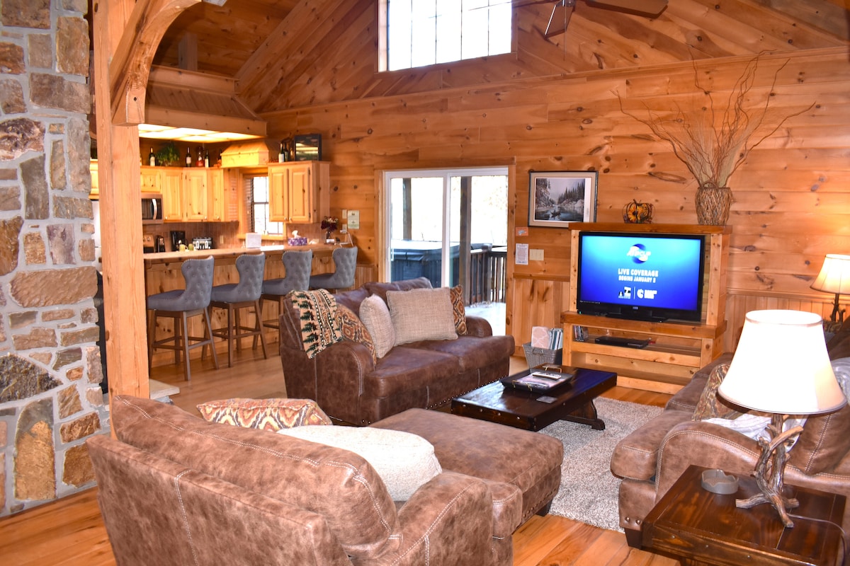 - Новий сучасний будівельний зруб - Діти зможуть ковзати з палуби, граючи в ігри на вулиці та смажити смаки у вогнищі - Камін, гідромасажна ванна, сезонний занурений басейн, газовий камін і патіо на вулиці з 65-дюймовим телевізором. - Геодом альпініст, підкова тетербол і корнхол - Двомісні апартаменти з великим двоспальним ліжком, суміжною ванною кімнатою та двома душовими. - Окрема бункерна кімната на верхньому поверсі. - Касіно, продуктові магазини, державний парк Біверс-Бенд розташовані приблизно в 10 хвилинах їзди від основного руху в Гочатауні.