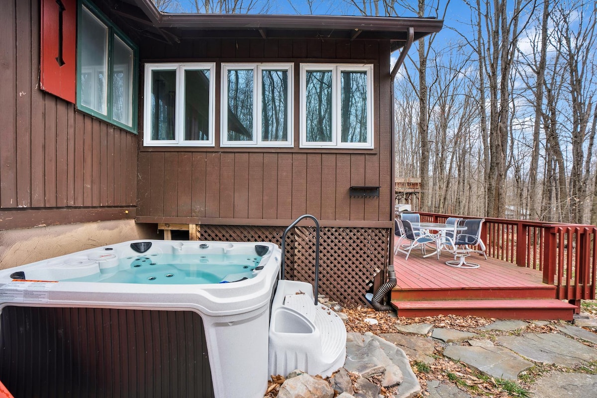 Пориньте в ідеальне поєднання спокою та романтики в нашому повністю відремонтованому зрубі Poconos. Він пропонує приватну атмосферу, перебуваючи в безпечному районі. Обіймайтеся в нашому ліжку у вітальні, насолоджуючись видом на ліс на задньому дворі через гігантське вікно. Відпочиньте у гідромасажній ванні або біля вогнища, де створюються спогади! Зруб розташований у центрі міста, забезпечує доступ до гірськолижних курортів і пішохідних стежок. Як гості, ви також матимете доступ до озера, басейну та спортивних кортів.