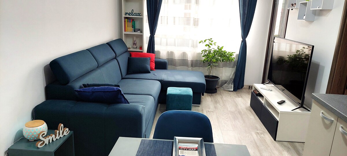 The apartment is in a quiet place. Has a parking lot. Is on the 3rd floor. The bed is 140x200. And the sofa is extandable. In the apartment you can find -towels -plates,bowls,cutlery,glasses -dishwasher with pods included -washing machine,also you will have some washing powder -electric oven -kettle -coffe machine -2 pots, 1 frying pan, also some condiments,oil,sugar,tea,etc... -smart tv -iron and an ironing table -also if you will need something else feel free to ask me before booking
