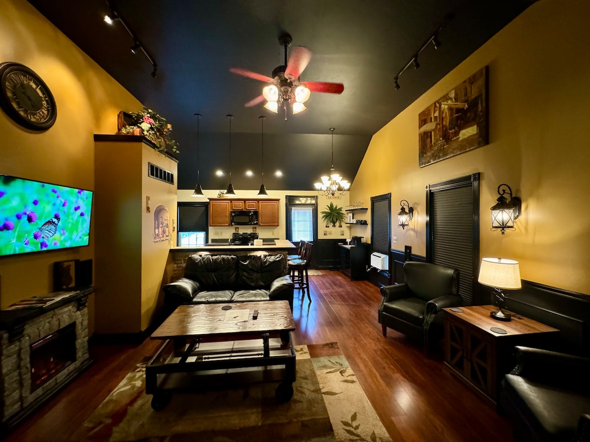 Чудовий 100-річний будинок у центрі міста, який був модернізований для вашої зручності. Сподіваємося, вам сподобається наше помешкання з однією спальнею та розкладним односпальним ліжком для додаткового гостя. Помешкання обладнане посудомийною машиною, пральною/сушильною машиною та кавовою станцією для початку дня. Приватний паркінг розташований позаду помешкання. Всього в двох кварталах від центру міста та пішохідна/велосипедна доріжка довжиною понад 10 миль на задньому дворі. Кілька хвилин їзди до Всесвітнього кінного спорту, розташованого в годині їзди від кількох великих міст.