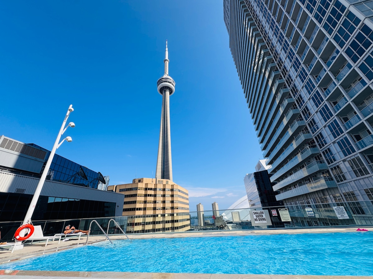 Відчуйте розкіш нашого просторого кондомініуму з парковкою в центрі Торонто. Насолоджуйтеся захоплюючим видом на вежу Сі-Ен Тауер з басейну на даху та розслабтеся в сауні, гідромасажній ванні та парній. Це стильно оформлене помешкання з достатньою кількістю спальних місць, включаючи 1 ліжко queen-size та 2 дивани king-size, 2 телевізори, що забезпечує комфорт і зручність. Обладнана кухня, балкон з видом на вежу CN і спеціальне паркувальне місце покращують ваше перебування. Вас оточать ресторани, магазини та розваги.