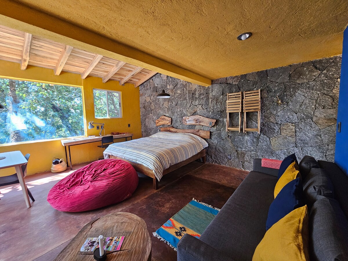 Ласкаво просимо до Ixaya, розкішного лофту, створеного для комфорту, приватності та атмосфери глибокого відпочинку посеред природи Тепостлана. Тут ви знайдете ідеальне притулок, щоб відпочити: ліжко розміру «king size», приватне джакузі з підігрівом (за додаткову плату), обладнана кухня, великі вікна та два ексклюзивні сади, які наповнюють кожен простір світлом та спокоєм. Розташована в тихому та безпечному житловому комплексі, всього за 12 хвилин від центру міста, ви можете насолодитися його унікальною енергією.
