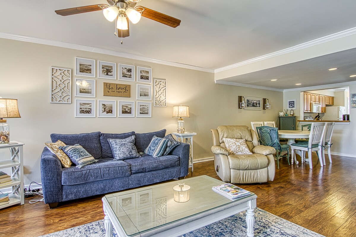 Прямий бік океану! Ідеально підходить для пар, відпочинку на тиждень або чогось між ними. Прогуляйтеся через вулицю до площі Коліньї, де більше 60 магазинів і ресторанів. Прокатіться на велосипеді більш ніж 100 миль по стежках. Парковка на території, басейн і безкоштовний Wi-Fi. Просто візьміть із собою купальник і рушник! Решту ми надаємо вам спокійний відпочинок; пляжні крісла, парасольку, кулер, всі кухонні спеції, кав 'ярня, шампунь, умови для миття тіла та припливні капсули!