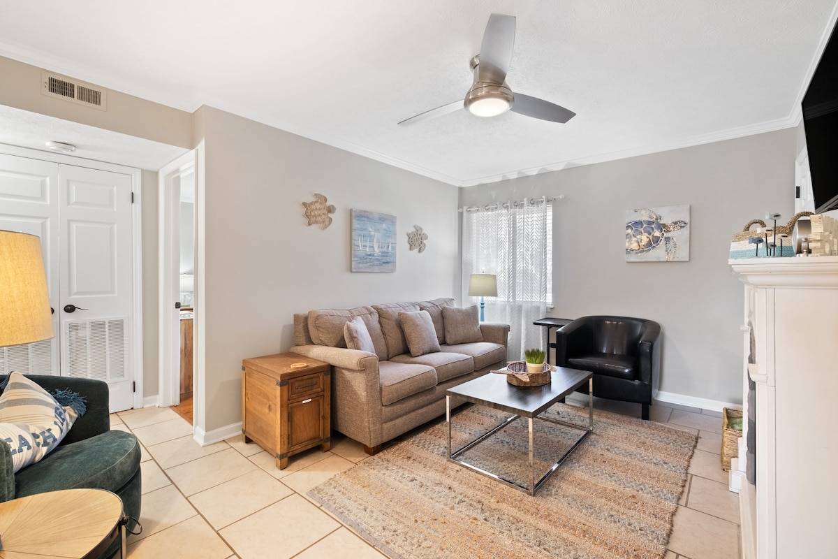 Приходьте розслабитися і насолоджуйтеся Hilton Head на South Forest Beach, найпопулярнішому районі острова. Прокатіться на наших безкоштовних велосипедах, щоб швидко дістатися до площі Коліньї, де знаходяться химерні місцеві магазини та ресторани. Пляж знаходиться в 2 хвилинах ходьби або менше, а басейн знаходиться трохи нижче по коридору. Наша квартира невелика, але ідеально підходить для парного відпочинку або незабутньої подорожі з дітьми. У нас є все необхідне, щоб ви почувалися як удома завдяки повнорозмірній кухонній техніці та пральній/сушильній кімнаті по сусідству.