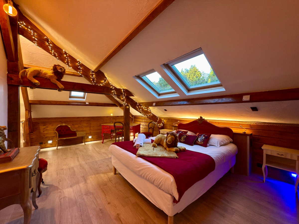 Відкрийте для себе наш романтичний люкс у центрі міста Конш-ан-Уш, між Парижем і Довілем, за 20 хвилин від Евре. Розташований неподалік від ресторанів і магазинів. Невелика парковка з електричними терміналами в 100 метрах. У цьому унікальному помешканні є затишна кухня-вітальня, душова кімната з зеленим бальнео та подвійний душ. Нагорі - зона відпочинку з сауною, шезлонгами та масажним столом. Спальня з ліжком розміру «queen-size» і великим дзеркалом. ++ Гойдалки та наручники для ліжок ++
