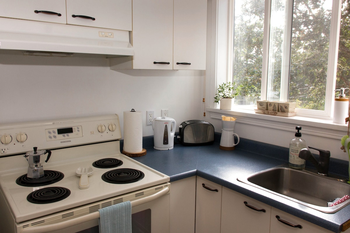 Затишно та чисто! Включно з очищенням озоном повітря між перебуваннями гостей. Повністю автономна студія в зручному місці Westshore! Окремий вхід із верандою, кухнею, пральною та сушильною машинами. Парковка поза вулицею, Netflix, Інтернет! Світле помешкання, затишне взимку і залишається прохолодним влітку. Поруч з університетом Royal Roads, пішохідними маршрутами, полем для гольфу, продуктовими магазинами та озерами. Якщо ви любите природу, маючи всі розкішні магазини та зручності, це саме те місце!