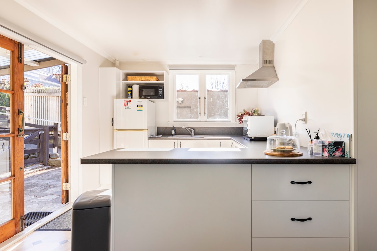 У 5 хвилинах їзди від центру Палмерстон-Норт. Просторий (60 кв. м) у гарному районі. Має ванну кімнату з душем, раковиною, туалетом, АЛЕ немає ПОВНІСТЮ обладнаної кухні. Має шафу, мікрохвильову піч, фен, фен, смарт-телевізор/NETFLIX, тостер, тарілки, столові прибори, роздрібна дошка, невелика духовка, електричний чайник, холодильник, холодильник, тепловий насос, чай, чай, кава та молоко. Примітка. Сніданок НЕ включено. Безкоштовна парковка на території/вулиці. Пральня та магазин молочних продуктів/магазинів знаходяться неподалік. Кілька ресторанів/супермаркетів і річкових прогулянок у 15-20 хвилинах ходьби.
