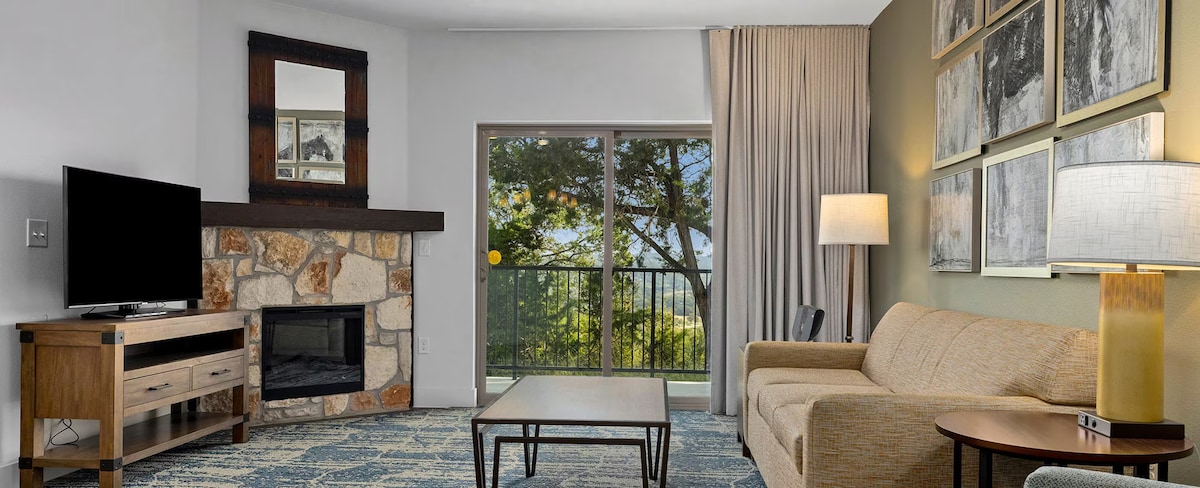 WorldMark Hunt - Stablewood Springs Resort поєднує в собі сільський шарм із сучасною архітектурою, побудованою з натурального каменю з дерев 'яних акцентів. Цей сільський курорт має зручності, які користуватимуться всією сім 'єю, такими як два відкритих басейни, водна гірка, фітнес-центр і гідромасажна ванна. У вашому люксі з двома спальнями можуть розміститися до восьми гостей і є повністю обладнана кухня, дві окремі ванні кімнати, пральна/сушильна машина, камін і балкон. Ознайомтеся з усім, що може запропонувати мальовнича гірська країна — відпочинок, виноробні тощо.
