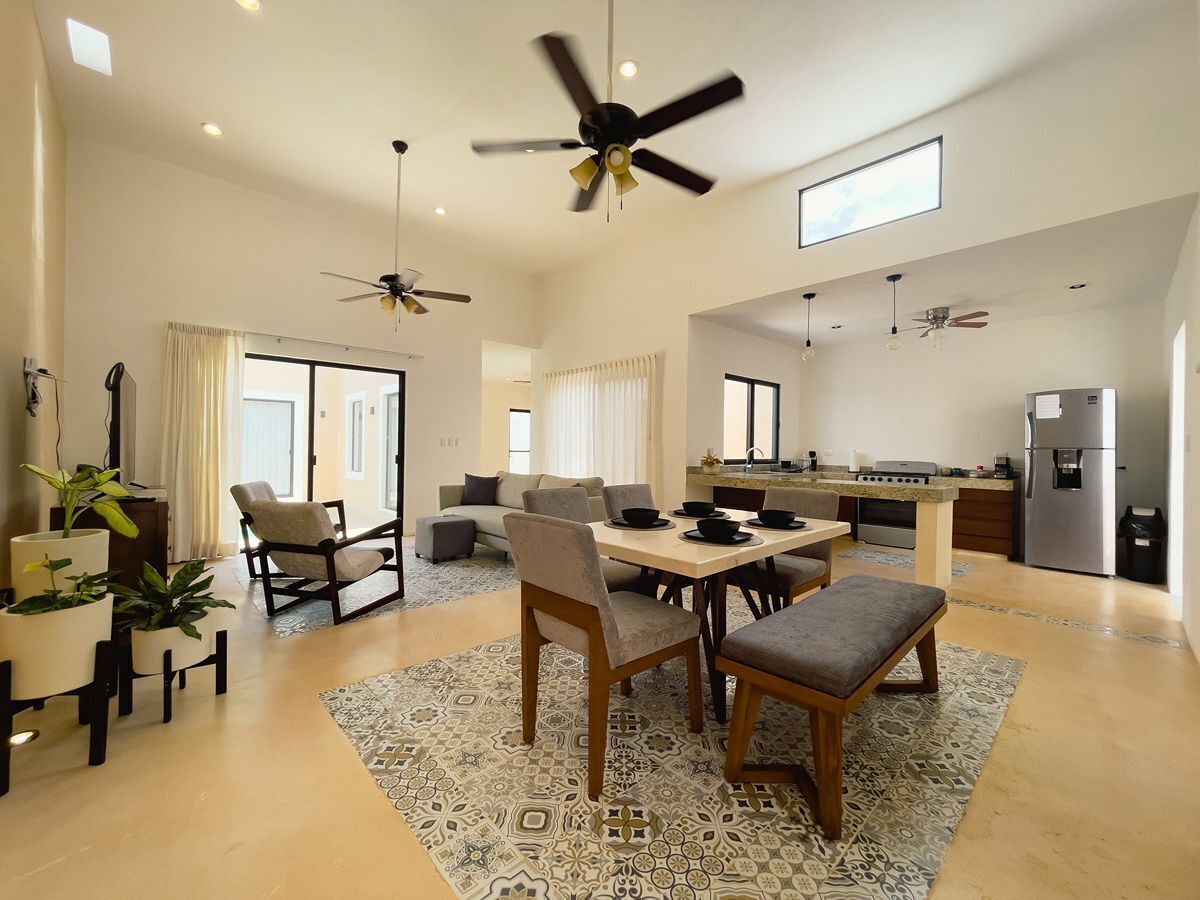 Modern and stylish home in a gated community with 24/7 security — perfect for remote work or vacation. Two bedrooms (King + Queen), each with a private bathroom, fully equipped kitchen, dedicated workspace, private pool, shaded BBQ area, and parking. Located in a quiet, safe area just 5 minutes from the Periférico and 25 minutes from downtown Mérida. A comfortable and functional stay in the northern part of the city.