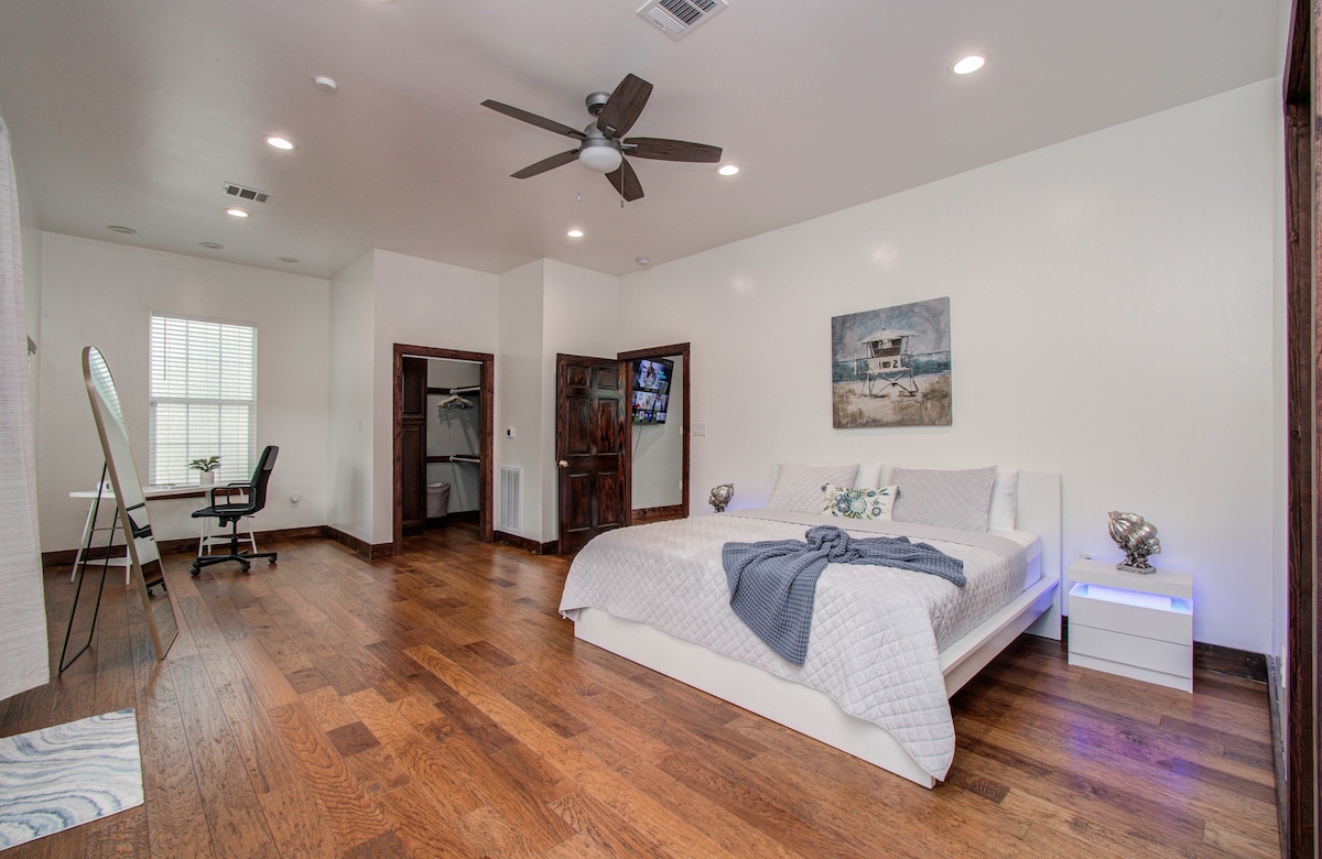 Відпочиньте і відпочиньте в цьому новому, сучасному, стильному помешканні. Розташований в центрі міста Конро. Надзвичайно близько до чудових ресторанів, розваг і конференц-центру Conroe. Близько 15 хвилин від озера Конро, цей відпочинок запам 'ятається! Насолоджуйтеся фільмом на даху під зірками або спогадами про відкриту вогнищеву яму на задньому подвір 'ї. Затишок перед 75-дюймовим телевізором. З телевізорами в кожній кімнаті, насолоджуйтеся спокійним нічним відпочинком на зручних ліжках.