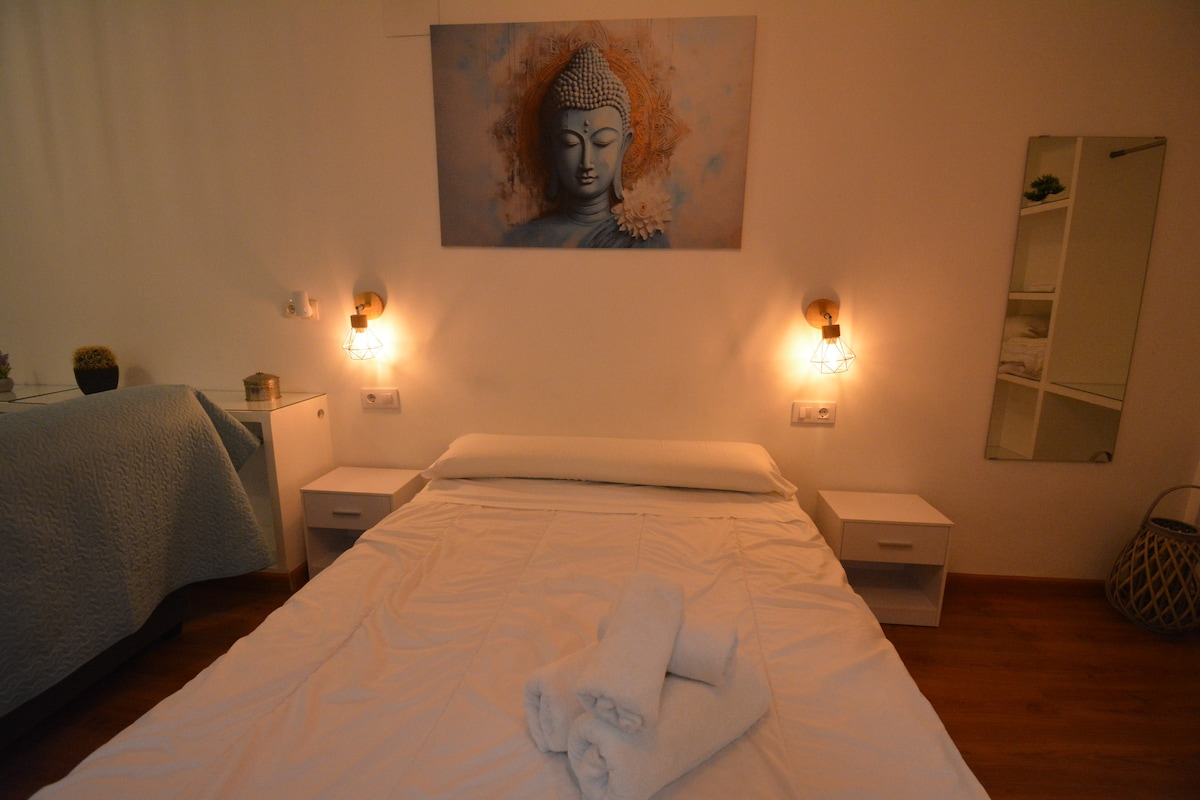Stunning and comfortable 2 bedrooms flat with a view to a nice park and green areas. This brand new apartment comprises a modern living-room, one bedroom with a double bed size and second bedroom with 2 individual beds. We can accommodate up to 5 people as we also provide a bed in the living room. In addition, 2 bathrooms and a fully equipped kitchen at your disposal. Love at first sight guaranteed!!! Amenities included (soap, gel, shampoo, bath towels)