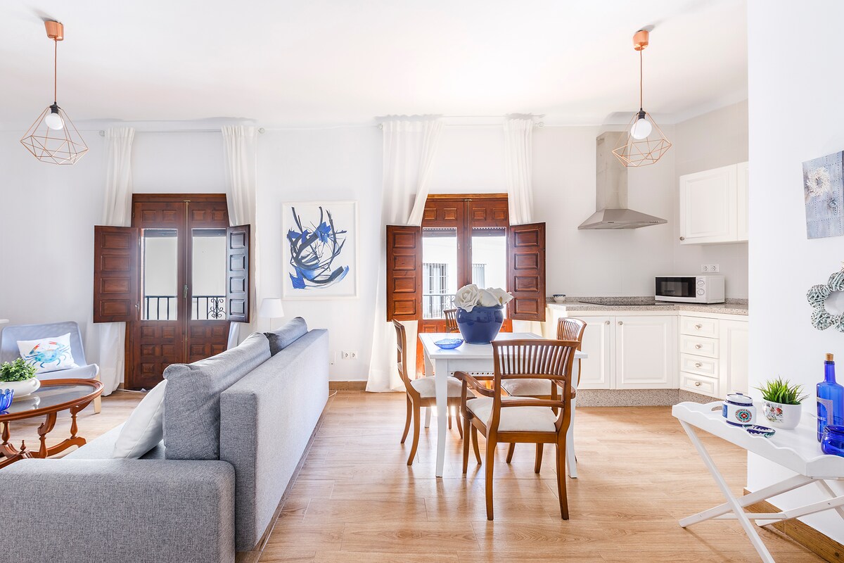 Casa las Flores — це прекрасний старий міський будинок на 3 поверхах (165 м2) + підвал, всього в 2 хвилинах ходьби від міської площі, затишної Пласа Альміхара. До будинку можна дістатися з вузької пішохідної вулиці. З передпокою є прямий доступ до кухні, їдальні та ванної кімнати. Через їдальню є вихід до спальні. На 2-му поверсі є вхід до ванної кімнати та двох спалень через вітальню, одна з яких має власний вихід на терасу. На третьому поверсі розташована вітальня з виходом на велику терасу. На даху є тераса.