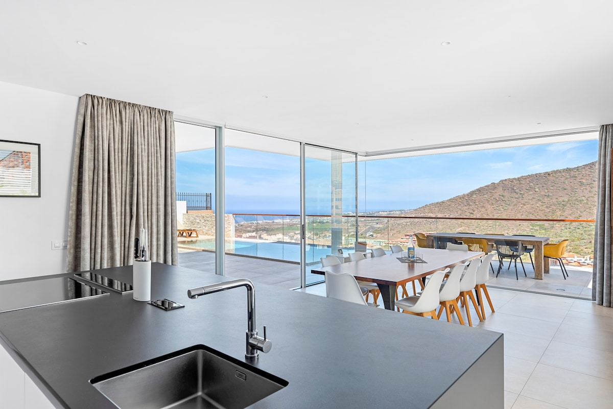 Ця унікальна вілла в престижній приватній частині Коста-Адехе пропонує фантастичний вид на океан, особливо в час заходу сонця. На віллі є величезна сонячна тераса з окремими їдальнями та зонами для загару, приватний басейн із солоною водою, красивий зелений сад. Будинок повністю обладнаний кондиціонером. До ваших послуг чотири розкішні спальні з ванними кімнатами. Усі ліжка обладнані надзвичайно зручним матрацом і високоякісною білизною. Кожна спальня має унікальний дизайнерський інтер 'єр і декор.