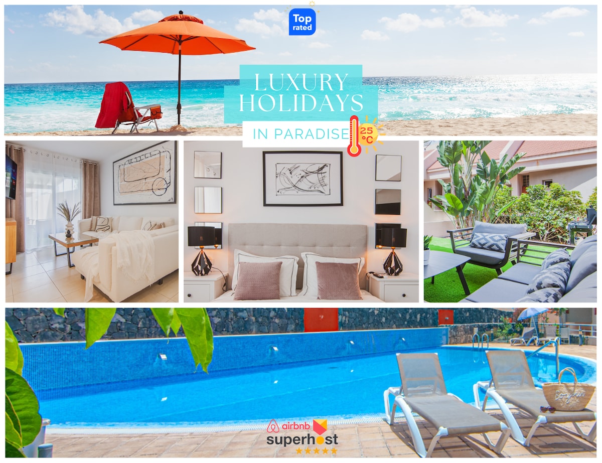 Nueva vIlla recién reformada con piscina privada climatizada y gran jardín de 300 metros cuadrados ubicada en primera línea del mar, en un entorno de hoteles de lujo como Sheraton La Caleta, Riu Palace, Coral Suites, H10 costa Adeje. Además forma parte del Residencial Adeje Park donde hay 3 piscinas, una de ellas climatizada y parque infantil. La famosa playa del Duque está a 800 metros a pie. También está muy cerca de la caleta de Adeje, un pueblo marinero famoso por sus numerosos restaurantes