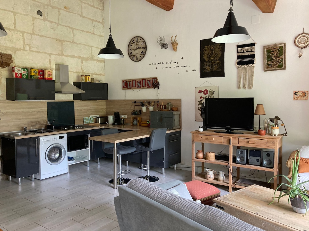 Ласкаво просимо до NOMAD SUITE, розкішного люкса, ідеально розташованого в центрі міста Коньяк та на площі Франсуа Прем'є. БЕЗКОШТОВНЕ ПАРКУВАННЯ + ЗАГАЛЬНИЙ ДВІР для зберігання велосипедів! Насолоджуйтеся приватним джакузі, доступним цілий рік, навіть взимку, і абсолютним спокоєм! Нещодавно відремонтований люкс дозволить вам на мить відключитися від реальності. Усе передбачено для вас, як у готелі! ♡🌴