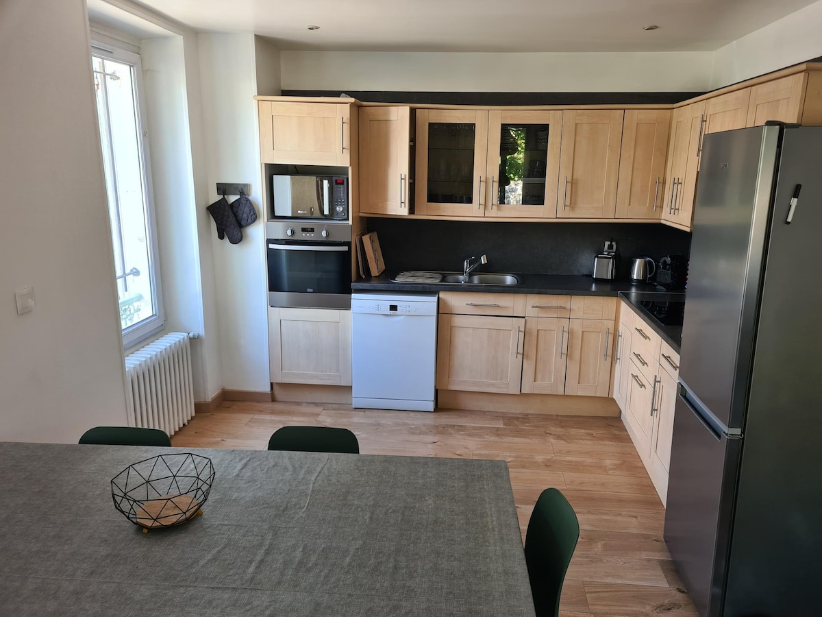 «Квартира T2 на першому поверсі в дуже тихому селищі Куртей ( 17 м від парку Астерікс). Вимірювання 23 м2, всі зручності з вітальнею та однією спальнею. Кухня, окрема, обладнана індукційною варильною поверхнею (з сковородами), холодильником, мікрохвильовою піччю та витяжкою, а також необхідним для приготування їжі. У душовій кімнаті є туалет і сушильна машина для рушників. У номері є праска з сушильною машиною для 2 осіб у 1 годині. Постільна білизна та рушники надаються.