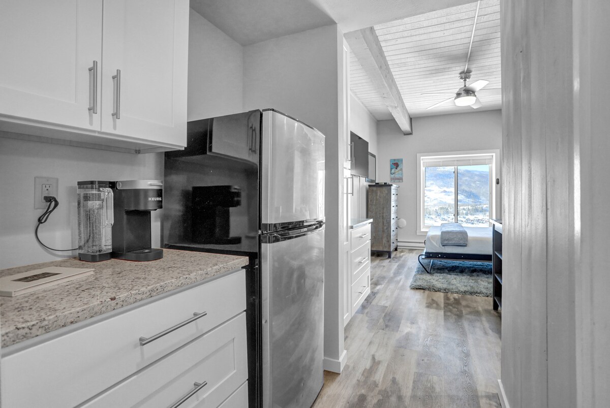 – 765 кв. футів, кондомініум на 1-му поверсі – Окреме патіо з чудовим видом на гору. – 2 великих продуктових/алкогольні магазини в 5 хвилинах ходьби. – 2 гідромасажні ванни кроки від вхідних дверей, щодня прибираються з підігрівом кімнатою з підігрівом – Ефективний газовий камін – Безкоштовний автобус до гори та центру міста — 5 хвилин у будь-якому напрямку. – Повністю укомплектована кухня зі спеціями, блендером та повним кухонним обладнанням. – Безкоштовна кава, чай і вівсянка надаються. – Мило, шампунь і кондиціонер надаються - Хвилини подалі від блакитної стрічкової форелі та основної стежки.