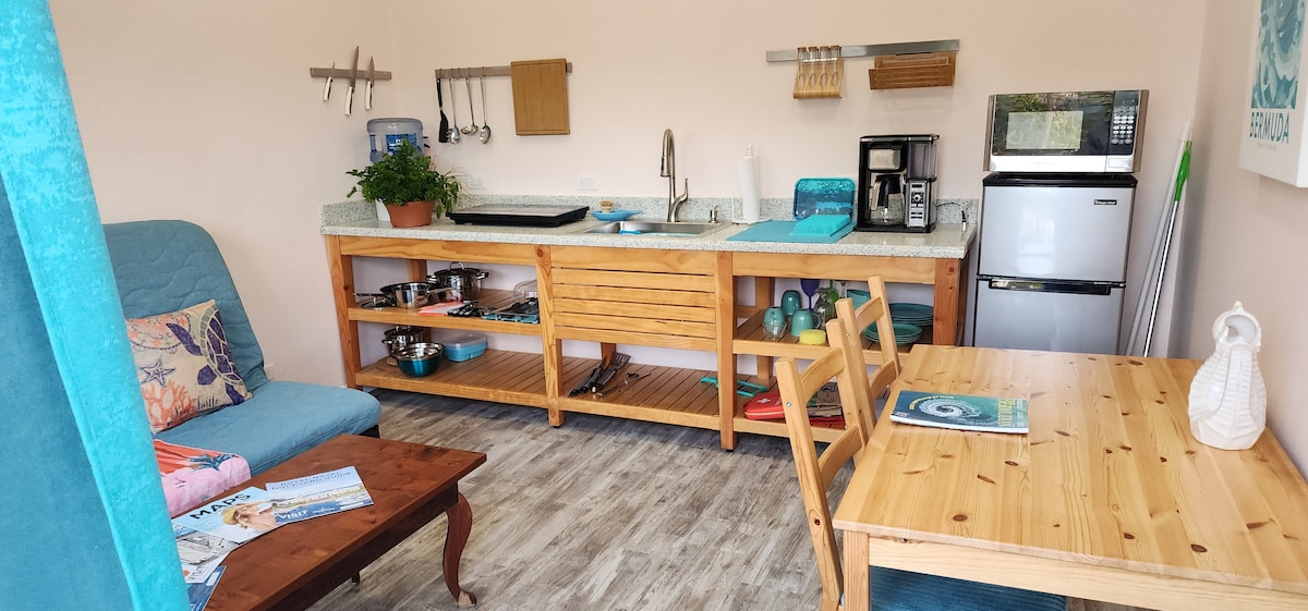 Сучасна студія на блискавці, на березі океану з захоплюючим панорамним видом на вишукані бірюзові води біля бурхливого південного берега. Яскравий і просторий з невимушеною мінімалістичною атмосферою острова. Добре обладнана міні-кухня, ідеально підходить для приготування ранкової кави або невеликих, простих страв, якими можна насолоджуватися в комфорті студії або на внутрішньому дворику на свіжому океанському повітрі. Центральне розташування в 10-15 хвилинах їзди від міста Гамільтон і недалеко від багатьох найкращих пляжів, ресторанів та пам 'яток Бермудських островів.