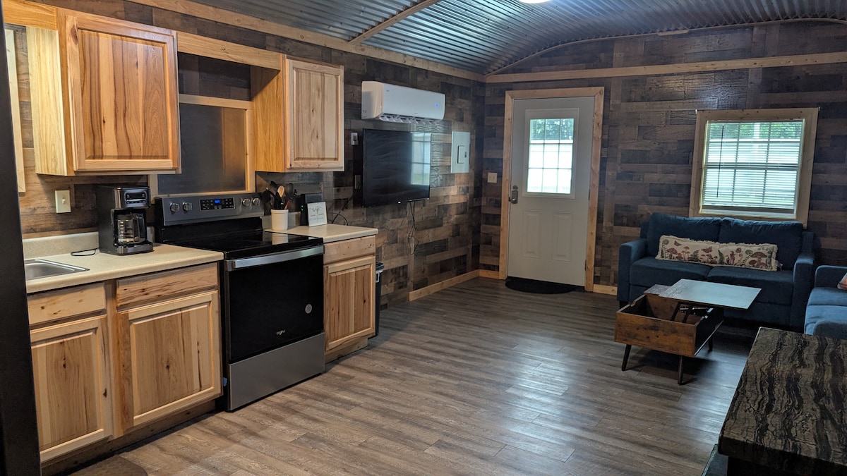 Невеликий будинок з 2 кімнатами та 2 лофтами. У кожній кімнаті та лофті є ліжко «queen-size», де достатньо спального місця для восьми осіб. Помешкання оформлене з відкритим плануванням підлоги та сумішшю дерев 'яного та сталевого інтер' єру, що додає тепла та шарму.