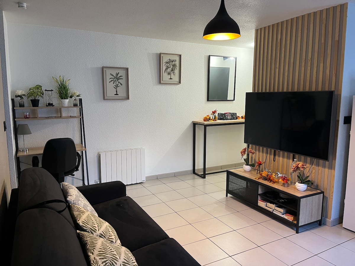 Спростіть своє життя в цій затишній квартирі-студії, що прилягає до нашого помешкання та в центрі міста, де є все необхідне, щоб почуватися добре. Провітріть свій розум за допомогою прогулянкової доріжки - велосипеда, розташованого безпосередньо за вами до ставка за 15 хвилин, насолоджуйтеся зоною відпочинку з TNT та Інтернетом або відпочиньте на невеликих садових меблях на вулиці. Насолоджуйтеся затишком природи!