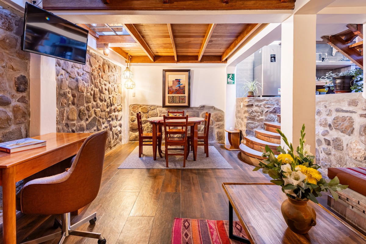 Ласкаво просимо в La Arqueria Colonial Residence. Помешкання, створене для того, щоб ви могли насолоджуватися своїми днями в Куско та перебувати в колоніальному особняку з 1600-х років всього в 3 кварталах від площі Армас і в півкварталі від музею Коріканча. Лофт має ліжко queen-size, вітальню, домашній стіл, їдальню, повністю обладнану кухню, окрему ванну кімнату з ванною, лофт з двомісним ліжком і терасою. Незалежний вхід із виходом до садів будинку.