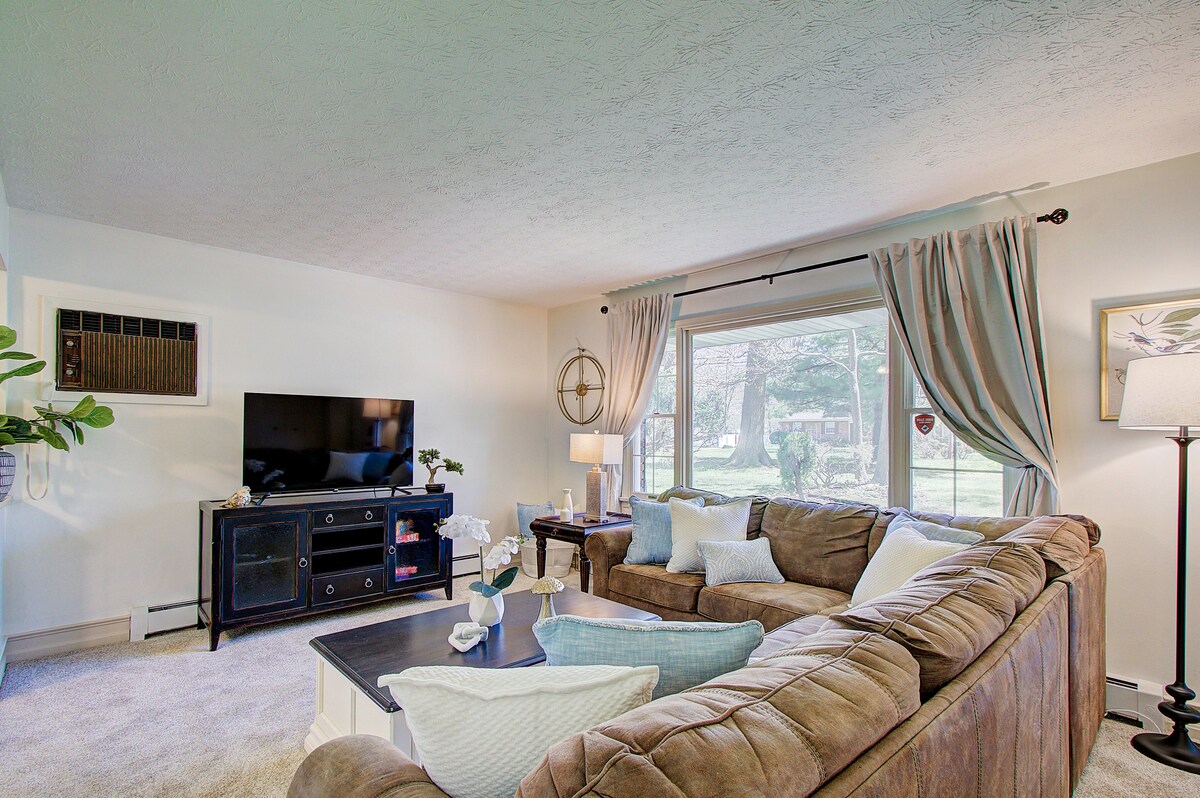 🚶 Пішки до Фронт-стріт: 14 хвилин пішки до ресторанів на березі річки, крафтових пивоварень, сезонних заходів. 🌲 Приватний оазис на задньому дворі: повністю огороджений, з дитячим майданчиком, оточений дорослими соснами 📍 Центральний базовий табір: поблизу Національного парку Кайахога-Валлі (6 миль), музичного центру «Блоссом», найкращих місцевих лікарень. ☕ Зручні додаткові зручності: повністю укомплектована кухня + куточок для кави з привітальними закусками ✨ Перлина 1955 року з високошвидкісним Wi-Fi, Smart TV та професійно прибраними інтер’єрами.