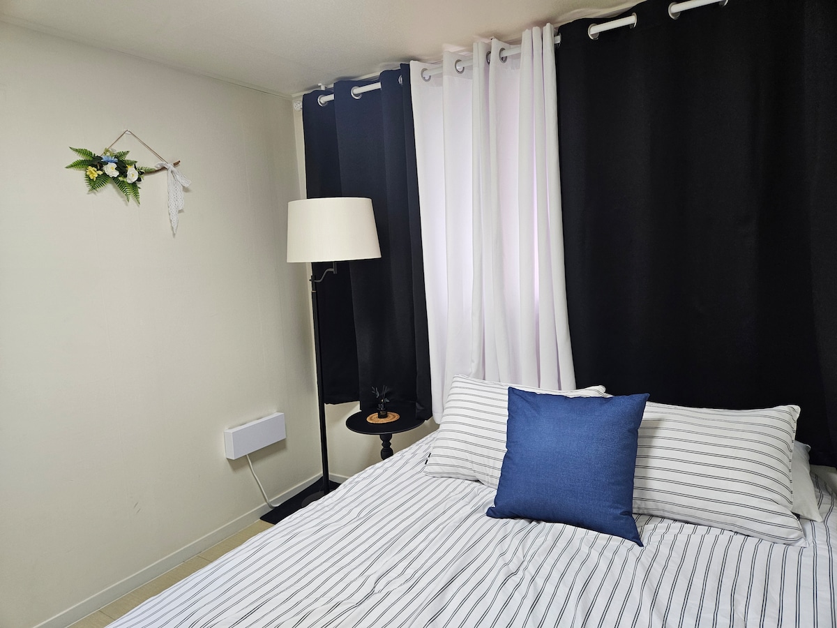 Вітає Це чотиримісний будинок, який ділить комфортне та затишне помешкання, як і мій дім. Будинок, який щодня доглядає в належному стані. Ми зробимо все можливе, щоб ваше перебування було комфортним. ★ Daegu Living Accommodation Facility Corporate Licensing ★ короткострокові ділові поїздки. Якщо вам потрібна тривалість бронювання Якщо вам потрібне помешкання під час★ шкільних канікул Якщо вам потрібно зареєструвати самостійне прибуття для подорожі до ★ Дегу Вбудований холодильник-студія★ Foul option. Пральна машина. Стельовий кондиціонер Повністю обладнано найновішими зручностями, такими як повітряний комод, кухонний посуд тощо. ★ Пухнастий і забезпечує комфортний нічний сон ★ Basrak Basrak Pleasant Pure Cotton High Divity Antibacterial Comforter Set ★ Розташована перед станцією Jungangno з видом на місто ★ Dongseong-ro. Універмаг Hyundai. Універмаг Lotte.Екскурсія стародавньою сучасною алеєю тощо Шопінг. Місця для відвідування. Міська подорож у медичному регіоні Наш заклад необхідний для підтвердження особи. Неповнолітнім (крім батьків) заборонено входити в помешкання. Наш заклад - це базовий візит для 2 осіб, але до 1 гостя перебуватимуть безкоштовно. У будівлі можлива парковка, але вона платна.