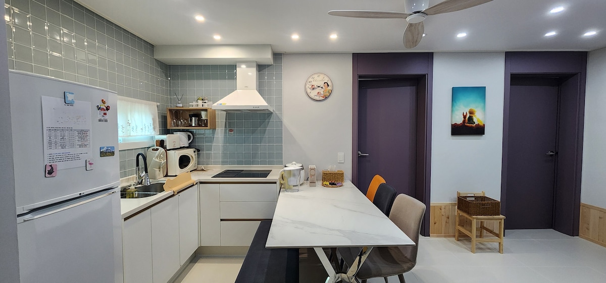 🏡 Представляємо «Aewol 309 View Stay». «Aewol 309 View Stay», розташований в Еволь Юсоам-рі, районі номер один, де жителі Чеджу хочуть жити найбільше, є будинком для однієї сім’ї, розташованим на висоті 309 м, де небо зустрічається з морем. Створіть незабутні спогади в просторому помешканні, де можуть розміститися 3 сім’ї. Конфігурація 🏠 помешкання * 4 кімнати, 3 туалети, 2 окремі кухні * Для сімей: простора вітальня на 14 осіб * Лікувальна зона: сонячна кімната з хорошим денним світлом, з’єднана з вітальнею з тонким ароматом білого кедра * Чудовий простір: тераса з видом на море та приватна студія на 1-му поверсі 🌅 Переглянути бали ресторану 180-градусний панорамний вид: із сонячної кімнати та тераси можна насолоджуватися сходом сонця за вершиною Халласану до червоного заходу сонця. ⭐ Романтична мансарда на 3-му поверсі Є вікно в стелі, де ви можете бачити нічне небо, тому ви можете провести мрійливий час зі своїми дітьми, шукаючи сузір’я. Ми пропонуємо особливу можливість для всієї родини насолоджуватися фільмами разом на великому 120-дюймовому екрані.
