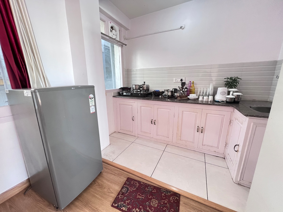 We welcome you to our serene top-floor retreat featuring 3 cozy bedrooms: 2 with wooden decor, 3rd one is a small size attic loft bedroom with attached living area. A shared balcony between the 2 bedrooms provides access to 2 washrooms. Enjoy ~80Mbps Wi-Fi, a 32" Smart TV, WFH desk, mini kitchen, power backup, and free indoor parking, next to local cafes. Thoughtfully maintained by a caretaker, cleaning aunty.
