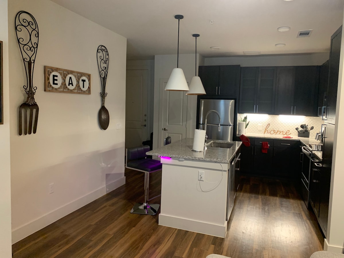 Насолоджуйтеся життям у курортному стилі у своєму помешканні з двома спальнями та двома ванними кімнатами в престижному районі Лас-Колінас в Ірвінгу, ідеальному для переїзду професіоналів, бізнес-мандрівників і віддалених працівників. В обох спальнях є ліжко king-size, а також повністю обладнана кухня, простора вітальня та окреме робоче місце. Відпочиньте в басейні нашого курорту та в бесідках на сонячній терасі, а потім вирушайте до найкращих магазинів і ресторанів. За кілька хвилин від міжнародного аеропорту DFW, аеропорту «Даллас Лав Філд» і штаб-квартир компаній зі списку Fortune 500.