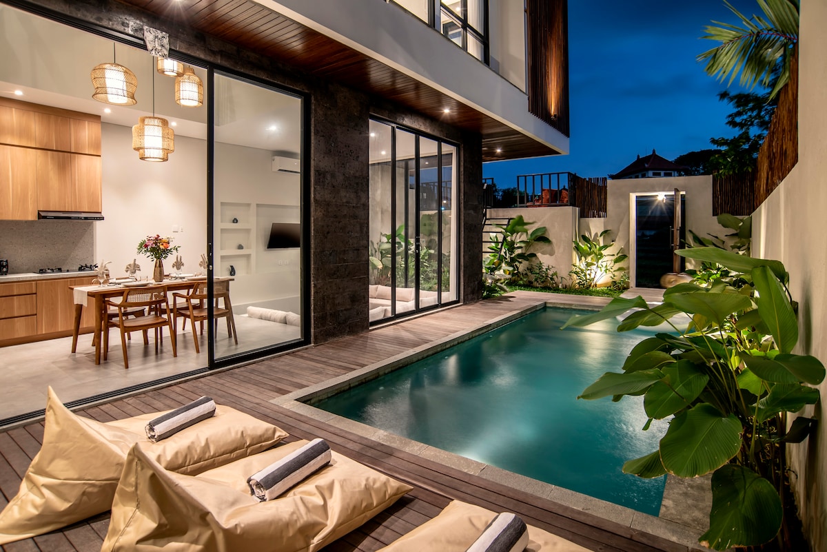 Enjoy your romantic private times in a luxurious complex, close to a fine selection of world-class cafes, restaurants and beach clubs. But perfectly hidden in a serene and quiet villa neighbourhood. This villa features an ensuite bathtub and offers a perfect dip-in pool. Enjoy your floating breakfast under the wood panels with sunlight gently pouring through. Chillax on the bean bag or sun loungers at your choice while soaking up the view of the garden.
