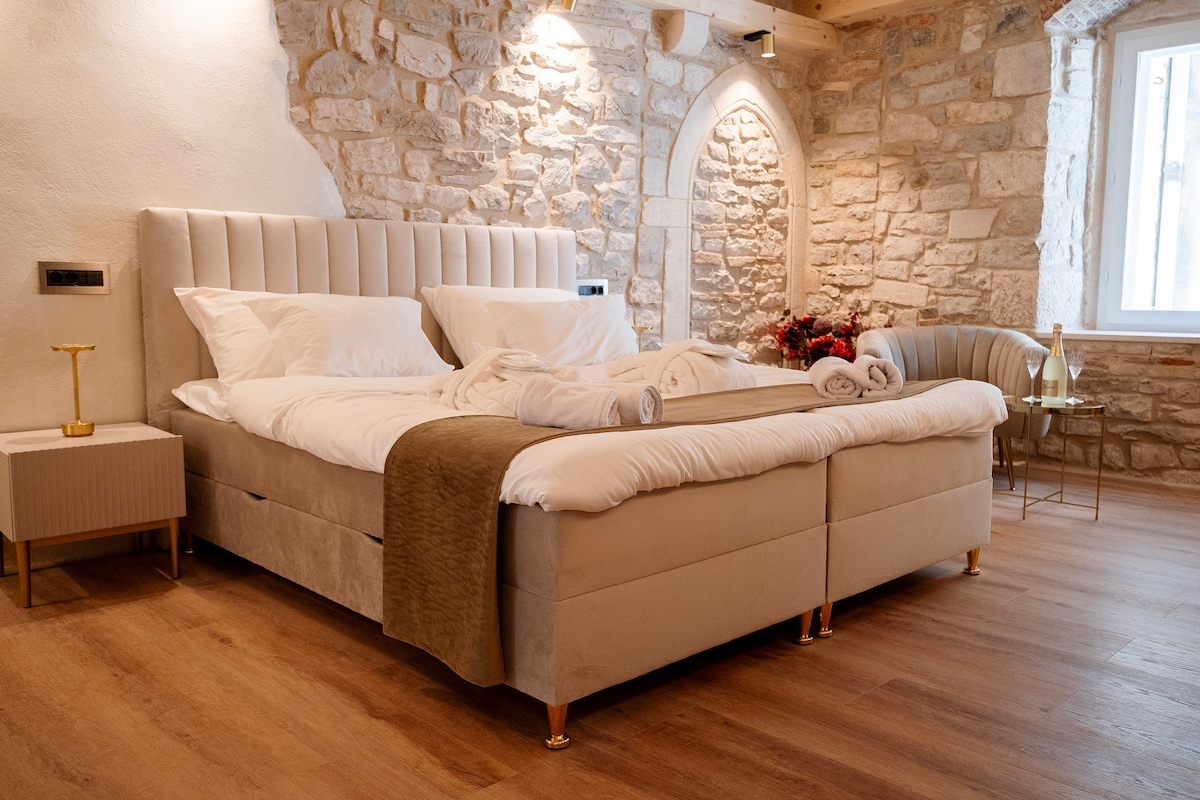 Прокидайтеся під відкритими балками багатовікових дерев 'яних стель. Будьте зачаровані антикварними штрихами, сходами в індустріальному стилі та вишуканою обробкою, розташованими за величезними внутрішніми кам 'яними арками Імператорського палацу. Прокинувшись історією, випийте келих вина з балкона цього унікального лофта після ознайомлення зі Сплітом, де музейні предмети прикрашають палітру з піском і приглушеними земляними відтінками.
