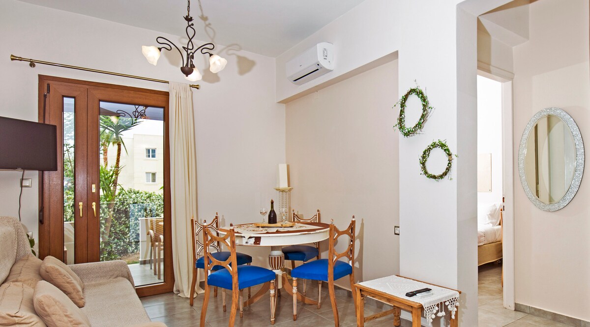 Cretan Sea view from the big private balcony or garden view from its large terrace. In the first area is the living room with a comfortable sofa and 2 anatomical armchairs which in total become 4 single beds.The second room is the master bedroom. Large Italian Stosa Kitchen fully equipped. In the apartment there are ceiling fan, AC, satellite TVs in every room.Our fully renovated bathroom in minimal tones, combined with the hydromassage column, offers you the luxury you deserve on your vacation!