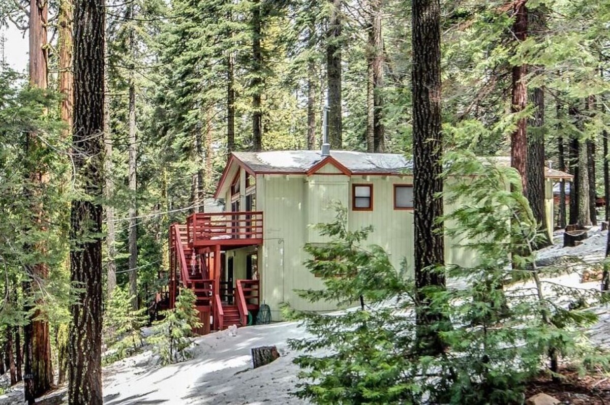 Наша хатина — ідеальне місце для відпочинку в горах. Незалежно від того, чи ви відвідуєте сусіднє озеро Твен-Харт, Пайнкрест, Йосеміті, чи просто хочете відпочити і насолодитися сидінням на задній терасі з келихом вина; Ви знайдете наше помешкання дуже спокійним і тихим помешканням у 4 хвилинах ходьби від міста! Взимку насолоджуйтеся каміном на дровах і спостерігайте за снігопадом у великих мальовничих вікнах і високій відкритій стелі з балками. Дрова не включені. Розташована в тихому районі, щоб відпочити від метушні
