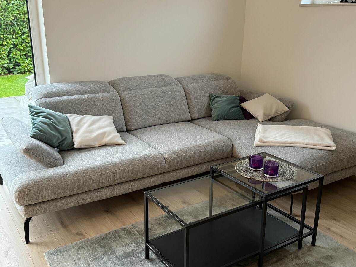 NEST NO.1 - a bright ambience in a clear feel-good design. On more than 110 sqm the guest can expect a spacious dining area, 2 cozy bedrooms with large double bed, a sunny kitchen, a daylight bathroom and a separate guest toilet. Our large living room invites you to linger on the large sofa. The terrace with a small garden offers additional space and in the evening you sit there and enjoy the last ray of sunshine and let the day end. Frankfurt airport: 28km, Frankfurt fair 37km.