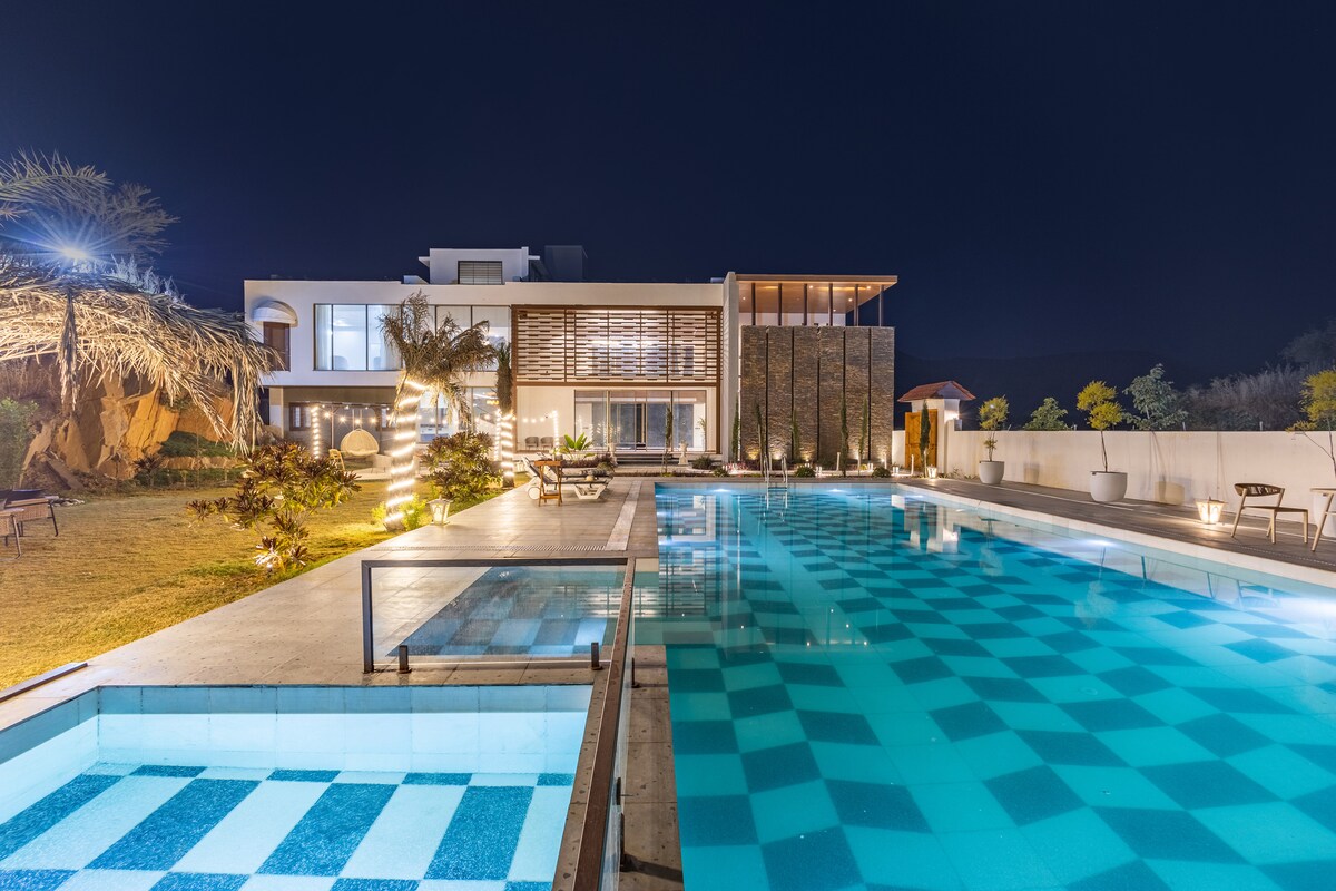 Розташовані на пагорбах, ці 80 000 кв. футів. Вілла 5-BHK переосмислює елегантність, пропонуючи візуальну та експериментальну насолоду. Його інтер 'єри доповнюються затопленою ямою з басейном подвійного призначення та столом для настільного тенісу. Зовні в саду є вражаючий валун, навколишні місця для відпочинку на відкритому повітрі та блискучий басейн. Насолоджуйтеся кіномарафонами в домашньому кінотеатрі з кріслами або розслабтеся в кутку для йоги та в тренажерному залі.