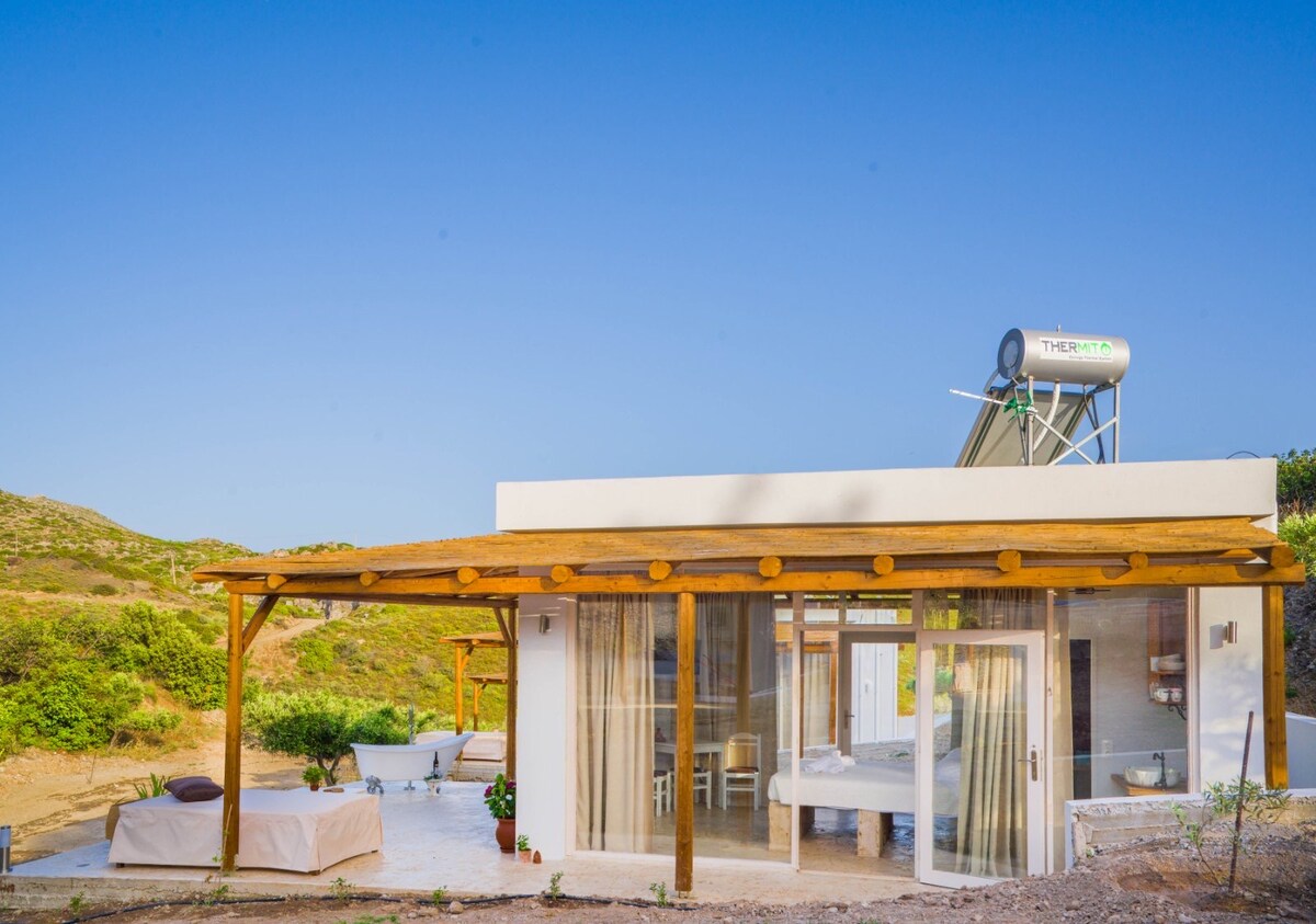 Ласкаво просимо до вашого особистого шматочка грецького раю – всього за 50 метрів від моря, де в саду цвітуть яктуси, а єдиний графік – це ритм хвиль. Це стильне бунгало з 2 спальнями ідеально підходить для пар, сімей або друзів, які шукають не просто місце для розміщення, а місце для відпочинку. Завдяки приватному паркінгу, кондиціонеру та надійному Wi-Fi ви зможете почуватися комфортно. Всього 1,2 км від шосе для легкого дослідження острова.