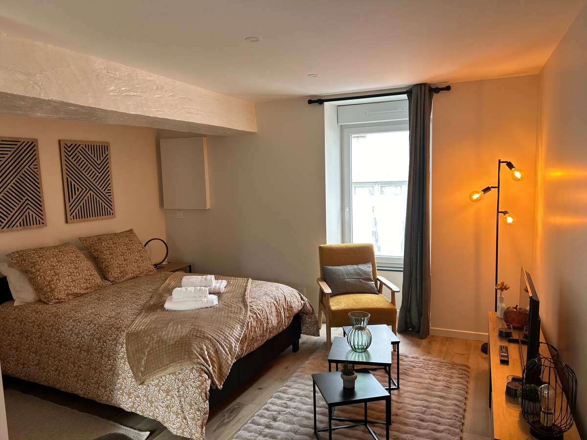 Наша студія (з окремим входом та приватною парковкою) простора і розташована на поверсі нашого житлового будинку. Він знаходиться недалеко від центру міста, недалеко від магазинів, замку, ринкових залів... Ви оціните наше помешкання за його спокій, яскравість і французький більярд, доступний для вашого використання. Наша оселя чудово підходить для пар і всіх гостей.
