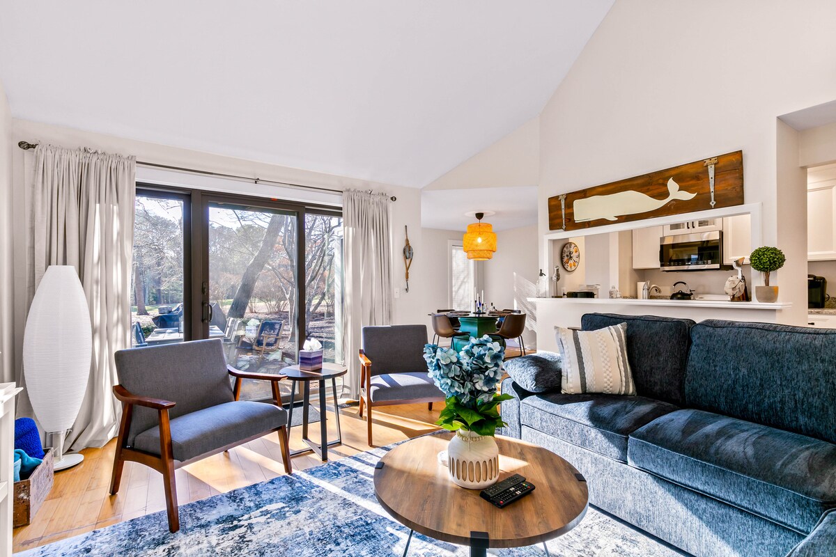 Stylish Cape Cod condo sleeps 4 — just 4 min to Mayflower Beach. Enjoy a renovated open-plan space with shiplap walls, a state-of-the-art kitchen, electric fireplace, and Smart TV. Private community pool, free parking, in-unit laundry & 500 Mbps WiFi. Perfect for couples, families, or remote workers. Steps from Dennis Village's best restaurants. Your coastal escape awaits.