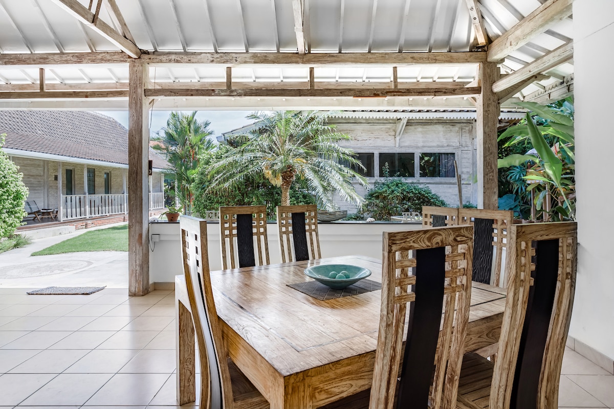 Розташована в самому серці балійського життя і недалеко від суєти Чангу і Керобокана, ця чудова вілла площею 300 м2, побудована на ділянці площею 800 м2, має розкішний ландшафтний сад. Оснащений басейном з двома басейнами, один з яких підходить для дітей і немовлят, ми будемо мати задоволення вітати всі сім 'ї. Складена з трьох балійських конструкцій, що змішують джогло і модернізм, вілла має 3 окремі спальні для своїх гостей. У кожному номері є двоспальне ліжко «кінг-сайз», власна тераса з зоною для сніданку та окрема ванна кімната з гарячою водою. Дуже зручні та ретельно оформлені кімнати будуть щодня прибиратися нашим обслуговуючим персоналом. Туалетна білизна та білизна для басейну будуть доступні протягом усього терміну вашого перебування. Можливість додати безкоштовне додаткове ліжко та сніданок для дитини до 10 років (запит за 72 години до вашого прибуття). Якщо у вас виникнуть запитання, зв 'яжіться з нами. Ми також пропонуємо нашим мандрівникам трансфер з аеропорту. Ціна цієї послуги (зустріч або висадка).18 € Для всіх перебувань тривалістю 12 ночей пропонується послуга обслуговування в аеропорту. Ціна реклами розрахована на дві кімнати з ліжком розміру «king size», включаючи континентальний сніданок. Додаткові особи понад четверту особу, крім першої дитини віком до 10 років, означають запит на додаткову кімнату. Гнучкий час прибуття навіть вночі за запитом. Сніданок подається на вашій приватній терасі або в спільній вітальні, що дозволяє обмінюватися інформацією з господарями про організацію подорожей або отримувати додаткову інформацію про туристичні об 'єкти острова. У кожному номері є чайник, мінеральна вода, чай і кава. Наш засіб для прибирання щодня отримуватиме доступ до вашої кімнати для її прибирання. Самокати в оренду доступні безпосередньо на сайті. Англомовний водій з якісним автомобілем, щоб зробити свій тур днів за запитом. Можливість замовити 60-хвилинний балійський масаж. Мобільний Інтернет (портативний модем 4G) доступний для оренди, щоб забезпечити ваш зв 'язок на ходу. Table d 'hôte, щоб поїсти ввечері на віллі (бронювання до 10:00 ранку). Можливість припаркувати до 6 двоколісних автомобілів на нашій приватній критій автостоянці. Помешкання тихо розташоване в типовому балійському районі, в декількох хвилинах від Петітенгет, Чангу та Семиньяка. До багатьох місцевих магазинів та ресторанів можна дістатися пішки, а аеропорт розташований неподалік. можливі приватні поїздки на автомобілі або самокаті Центральне розташування для відправлення ваших екскурсій з непередбачуваного трафіку Чангу і Семіньяк, що дозволяє вам випромінювати над більшою частиною острова без необхідності щоденної зміни проживання. Відпочинок, спокій і гарантована економія часу. Для ваших дітей багато заходів, таких як відомий міжнародний скейт-парк «Amplitude Skate Park», де щорічно проводяться змагання Redbull. Настільні ігри та читання доступні на сайті. Безкоштовний якісний Wi-Fi на сайті.