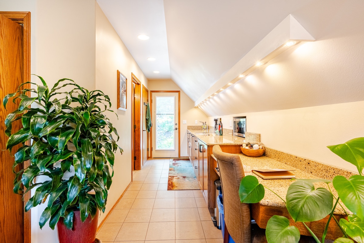 Наше велике (1500 кв. футів) приміщення (приватний доступ) має спальню, ванну кімнату, вітальню з каміном, гідромасажну ванну, повний тренажерний зал, а також міні-кухню з повнорозмірним холодильником, кавомашиною, мікрохвильовою піччю, аерогрилем, тостером, одноконфорковою плитою та пральнею. У зоні розваг на відкритому повітрі є смарт-телевізори, гамаки та чаша для багаття на даху. Дружнє ставлення до ЛГБТ та BIPOC. Тренажерний зал, гідромасажна ванна та пральня використовуються спільно з власниками, але гості мають пріоритетний доступ. Поруч із дикою природою Маунт-Худ (45 хвилин) та центром Портленда (15 хвилин).