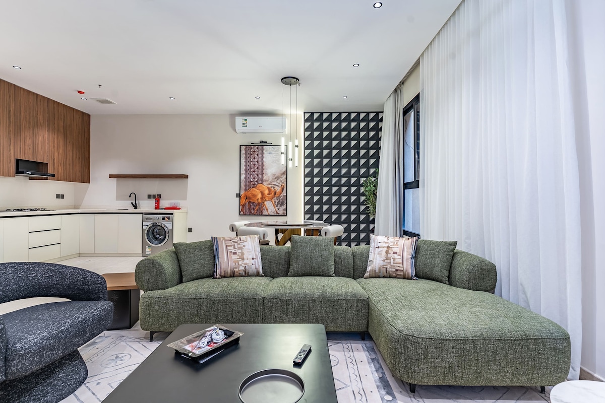 Відчуйте справжнє життя найді в єдиній квартирі в Ер-Ріяді, повністю оформленій у стилі найді. Від традиційного входу в комплекс Al-Majdiah 155 до кожної деталі всередині – ви занурюєтеся в саудівську спадщину. Відпочиньте в просторій вітальні з відкритою кухнею, насолодіться Smart TV після огляду розташованого неподалік об'єкта ЮНЕСКО Дір'ї (10 хвилин їзди). Дві спальні – головна спальня з ліжком king-size + кімната з односпальним ліжком – ідеально підходять для сімей. Безкоштовна підземна парковка та самостійне прибуття за допомогою особистого коду. Ваше знайомство з саудівською культурою починається тут.