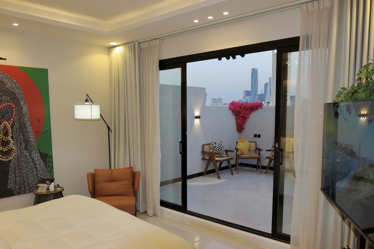 A modern apartment designed for an exceptional stay, located in one of Riyadh’s finest neighborhoods with a stunning view of KAFD. It features an outdoor seating area with a screen and projector for enjoyable evenings. For your comfort, the bed includes a high-quality 14cm extra layer. “We also offer event coordination services for special occasions (including cake and accessories) for an additional fee with prior booking, ensuring an unforgettable experience “